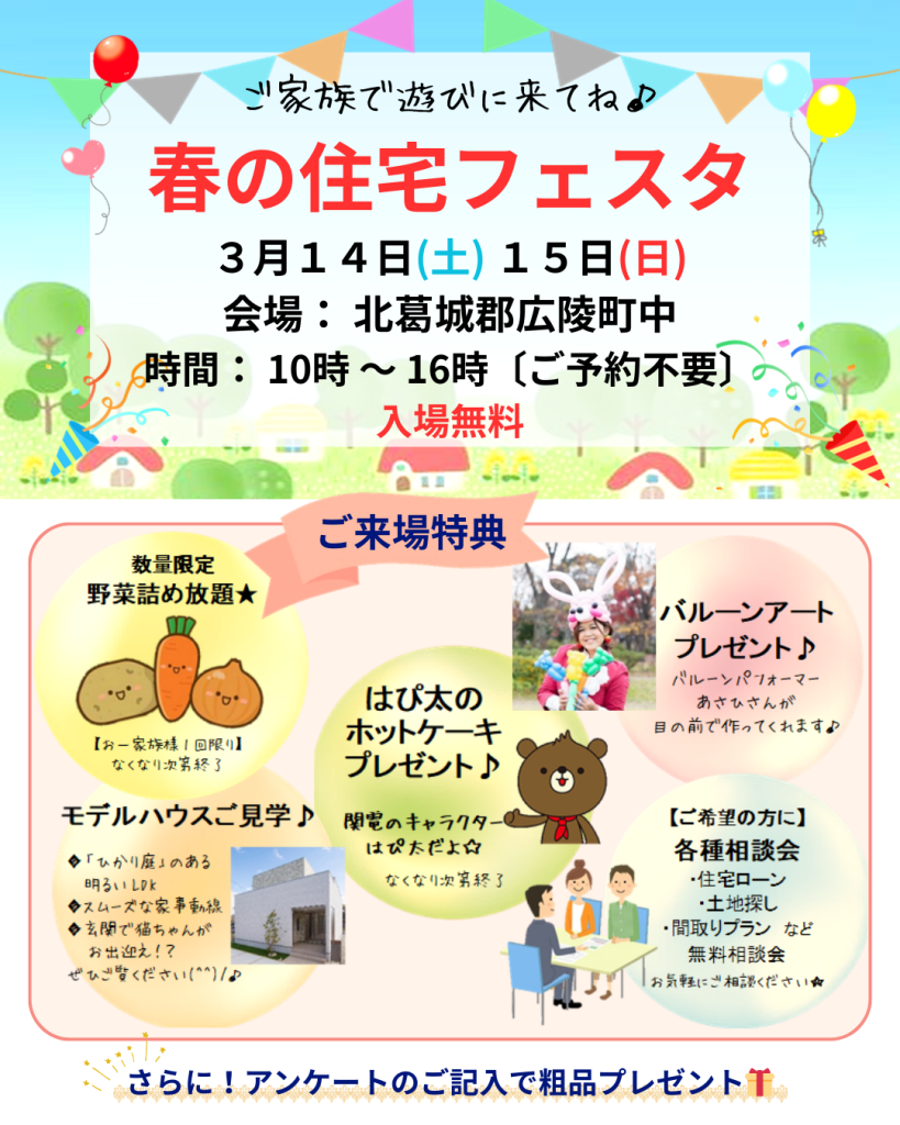 豊富住建 春の住宅フェスタ2026 2026年3月14日(土)〜15日(日)開催各日10:00〜16:00 2026年3月14日(土)〜15日(日)開催各日10:00〜1600 モデルハウス会場にトイレはございません。予めご了承くだ...