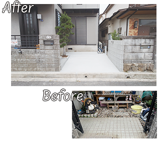 正面のブロック塀を一部撤去し、間口を広く確保。隣家との境には新たにブロック塀を設け、美観とプライバシーを両立しました。