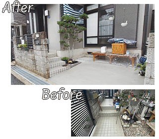 正面のブロック塀を一部撤去し、間口を広く確保。隣家との境には新たにブロック塀を設け、美観とプライバシーを両立しました。